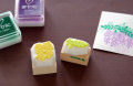 インクの色を変えてみました。葉っぱの部分はartnicのスプリンググリーン色、花のところは濃い紫がバイオレット色、薄い紫がアザレア色で押しています。インクをつけなおさずに重ねて二度押しすると後ろにうっすらと藤の花が揺れている感じになって素敵です。たくさん押せば押すほど藤の花が増えていってテンションが上がります。(笑)